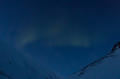 The Norwegian language has a number of words describing the wind strength that do not exist in Finnish. In any case, there is a warning of an approaching "small storm" (strong gale, winds over 24m/s, 86km/h) that may be closer to a hurricane in some of the more exposed areas in Svalbard. Good thing we are between a couple of mountains in a relative safety. All untied objects were brought inside, though, and it will be interesting if the airplane from Tromsø will arrive tomorrow. Ski goggles go into the daypack in any case...