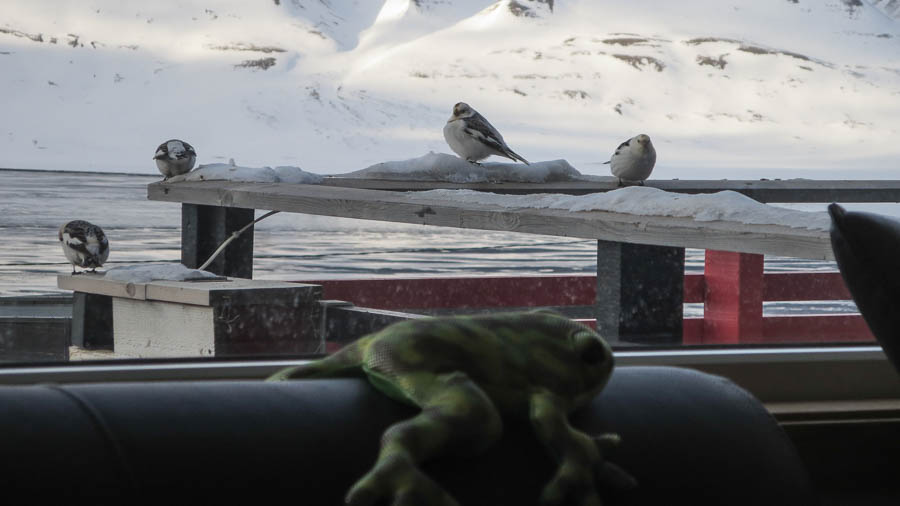 Nyt lunta on vähän liikaakin ja ihan väärissä paikoissa. Onneksi näkyvyys on huono ja tuulikin aika napakka, joten malttaa pysytellä kylillä. Tosin kyllähän kylälläkin tapahtuu: Nybyenin rakennukset on evakuoitu toistaiseksi, koska tunturin reunalla notkuu hillittömän kokoinen lumilippa, joka voi romahtaa alas hetkenä minä hyvänsä. Yön valoisina tunteina oli myös kotivuonon toisella puolella olevan Hjortfjelletin seinämä tullut alas. Onneksi meidän kämppä on turvallisessa paikassa.