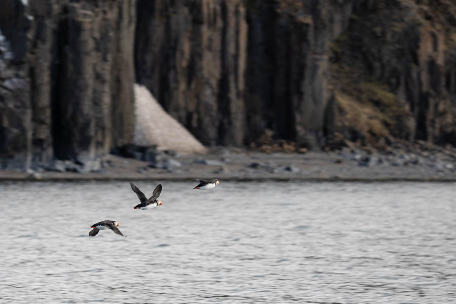 A warm summer evening invited us for a nice evening drive. The hydrophone was in the boat, so we did not see any whales. On the other hand, there were quite a bit of puffins flying around and paddling around in front of the bird cliffs. It was nice that there was a break in the cloud cover and the light was really nice.